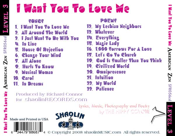Photography by The Hippy Coyote: The Levis jacket has a TAI MANTIS patch on it. This was before I created Shaolin Chi Mantis. Prepress by The Hippy Coyote: Editing was done in Photoshop. The album cover graphic arts were created using Quark. The first batch of 20 CDs was created so I could get the album on iTUNES and elsewhere. These first 20 cds were so much work that I autographed them and signed them with numbers 1 of 20, 2 of 20... I glued the front and back covers together, because I couldn't print 2-sided on my home printer. The CDs were printed by FedEx and then I burned the music on them. |